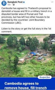 ភ្នំពេញ៖ តាមរយៈ សេចក្តីបំភ្លឺ នៅរាត្រីថ្ងៃទី២៦ ខែកញ្ញា ឆ្នាំ២០២៥ យោធភូមិភាគទី៥ នៃកងយោធពលខេមរភូមិន្ទ សូមបំភ្លឺចំពោះការចោទប្រកាន់ ពាក់ព័ន្ធនឹងករណីរុះរើ ផ្ទះ១ខ្នង នៅចំណុចអូរភ្លុកដំរី ថាជាការកាត់ដីកម្ពុជាទៅឱ្យប្រទេសថៃនោះ គឺជាការមិនពិត និងប្រាស់ចាក ទាំងស្រុងពីស្មារតី នៃខ្លឹមសារលិខិតលេខ ០០២/២០២៥ ចុះថ្ងៃទី២២ ខែកញ្ញា ឆ្នាំ២០២៥ និងគ្មានមូលដ្ឋាន ផ្លូវច្បាប់ ដោយហេតុថា ការងារខណ្ឌសីមា និងបោះបង្គោលព្រំដែន គឺជាសមត្ថកិច្ចរបស់គណៈកម្មការចម្រុះ ខណ្ឌសីមាព្រំដែនគោក (JBC) កម្ពុជា-ថៃ។ ជាមួយគ្នានេះ ការអះអាងអំពីសមត្ថកិច្ចនេះ ក៏បានបញ្ជាក់បន្ថែមផងដែរ នៅក្នុងខ្លឹមសារនៃកំណត់ហេតុកិច្ចប្រជុំពិសេសលើកទី១ របស់គណៈកម្មាធិការព្រំដែនទូទៅ GBC ថ្ងៃទី១០ ខែកញ្ញា ឆ្នាំ២០២៥។