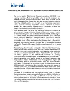 អង្គការអ្នកប្រជាធិបតេយ្យនិយមកណ្តាលអន្តរជាតិ (CDI-IDC) បានអំពាវនាវឱ្យមានការដោះលែងជាបន្ទាន់ និងដោយគ្មានលក្ខខណ្ឌ ទាហានកម្ពុជាចំនួន ១៨នាក់ ដែលត្រូវបានកងទ័ពថៃចាប់ខ្លួនដោយខុសច្បាប់ នៅថ្ងៃទី២៩ ខែកក្កដា ឆ្នាំ២០២៥ ក្រោយបទឈប់បាញ់ ចូលជាធរមាននៅថ្ងៃទី២៨ ខែកក្កដា ឆ្នាំ២០២៥។