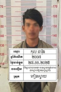 ៧.ឈ្មោះ កុល ដារ៉ុង ភេទប្រុស អាយុ១៨ឆ្នាំ ជនជាតិខ្មែរ មុខរបរកសិករ មានលំនៅភូមិរាំងដេក ឃុំគគីរធំ ស្រុកកៀនស្វាយ ខេត្តកណ្ដាល (ជនដៃដល់កាន់ផ្គាក់វែង ឃាត់ខ្លួន) ។