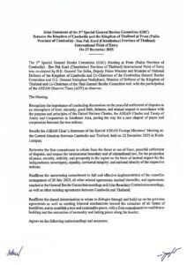 សេចក្ដីថ្លែងការណ៍រួម នាព្រឹកថ្ងៃសៅរ៍ ទី27 ខែធ្នូ ឆ្នាំ2025នេះ ស្ដីពីនៃកិច្ចប្រជុំពិសេសគណៈកម្មាធិការព្រំដែនទូទៅ (GBC) លើកទី3 រវាងព្រះរាជាណាចក្រកម្ពុជា និងព្រះរាជាណាចក្រថៃ នៅច្រកព្រំដែនអន្តរជាតិព្រំ ខេត្តប៉ៃលិន ប្រទេសកម្ពុជា-បានផាកកាត ខេត្តចន្ទបុរី ប្រទេសថៃ។