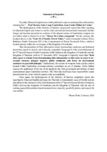 ក្រសួងមហាផ្ទៃ ចេញសេចក្ដីប្រកាសបដិសេធការផ្សព្វផ្សាយមួយចំនួនរបស់ថៃថា “ទាហានជើងទឹកថៃរឹបអូសឃ្លាំងសព្វាវុធកម្ពុជា ក្នុងអគារកាស៊ីណូថ្មដា” ខណៈដែលការពិត គឺទីតាំងនោះជា “ប៉ុស្តិ៍នគរបាលការពារព្រំដែនគោក ច្រកផ្លូវ56” ដែលស្ថិតក្នុងដែនអធិបតេយ្យកម្ពុជា។