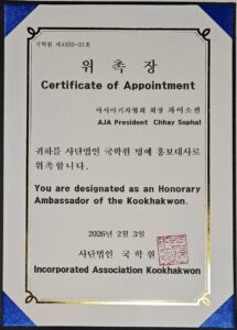 ឯកឧត្តមបណ្ទិត ឆាយ សុផល រដ្ឋលេខាធិការក្រសួងព័ត៌មាន នៅសប្តាហ៍នេះ ត្រូវបានវិទ្យាស្ថាន Kookhakwon ឬ វិទ្យាស្ថានសិក្សាវប្បធម៌កូរ៉េពីបូរាណ (Institute for Traditional Korean Culture Studies) តែងតាំងជាឯកអគ្គរដ្ឋទូតកិត្តិយសម្រាប់វិទ្យាស្ថាននេះ។