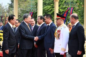 នាព្រឹកថ្ងៃសុក្រ ទី6 ខែកុម្ភៈ ឆ្នាំ2026នេះ នៅព្រះបរមរាជវាំងសម្ដេចតេជោ ហ៊ុន សែន ប្រធានព្រឹទ្ធសភាកម្ពុជា បានអញ្ជើញជាព្រះរាជតំណាងដ៏ខ្ពង់ខ្ពស់បំផុត របស់ព្រះករុណា ព្រះបាទ សម្ដេចព្រះបរមនាថ នរោត្តម សីហមុនី ព្រះមហាក្សត្រនៃព្រះរាជាណាចក្រកម្ពុជា ទទួលបដិសណ្ឋារកិច្ចស្វាគមន៍ផ្លូវរដ្ឋជូន ឯកឧត្តម តូ ឡឹម អគ្គលេខាធិការបក្សកុម្មុយនីស្តវៀតណាម ជាមួយនឹងជំនួបសាវនាកាផងដែរ។